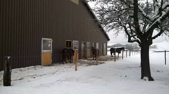 En été, chaque box-terrasse est ouvert sur un grand pré individuel accessible 24h/24. En hiver, les chevaux disposent d'une terrasse de 60m2 et le pré est ouvert dès que les conditions le permettent.